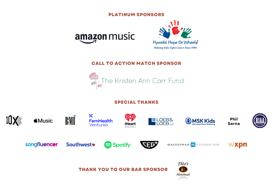 Anthems of Healing Host Committee members included The Carr-Marsh Family, Sara Crown Star, Mitch Glazier, Stephen Mack, Lee Perlman, Tom Poleman, Alissa Pollack, Karen Rosenberg, Steve Savoca, Michael Solomon, Vivek J. Tiwary and Scott Welch. In addition to their generous contributions, this special event was made possible by Platinum Sponsors Amazon Music and Hyundai Hope On Wheels, Bar Sponsor Tito’s Handmade Vodka, and Musicians On Call’s dedicated partners including 10x Management, Apple Music, BMI, FemHealth Ventures, iHeartRadio, The Kristen Ann Carr Fund, Loeb & Loeb, MSK Kids Memorial Sloan Kettering, Phil Sarna, Recording Industry Association of America, Songfluencer, Southwest Airlines®, Spotify, Tiwary Entertainment Group, Wasserman Foundation and WXPN. A $25,000 match of all donations from the night was made thanks to the generosity of The Kristen Ann Carr Fund.