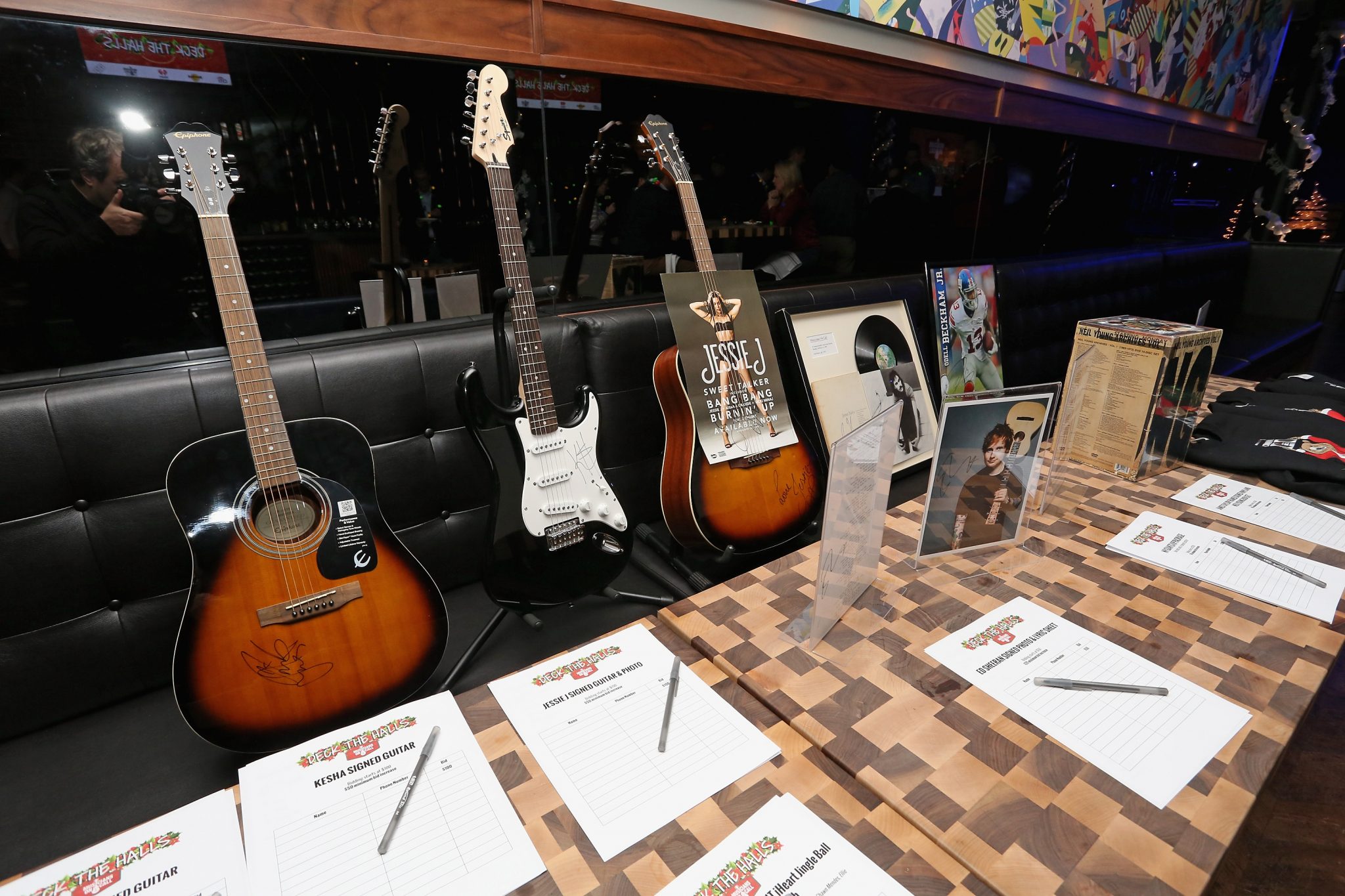 - NEW YORK, NY – DECEMBER 08: Guitars and other items up for auction during the Musicians On Call Deck The Halls Holiday Sweater Party at Kola House on December 8, 2016 in New York City. (Photo by Donald Bowers/Getty Images for Pepsi)